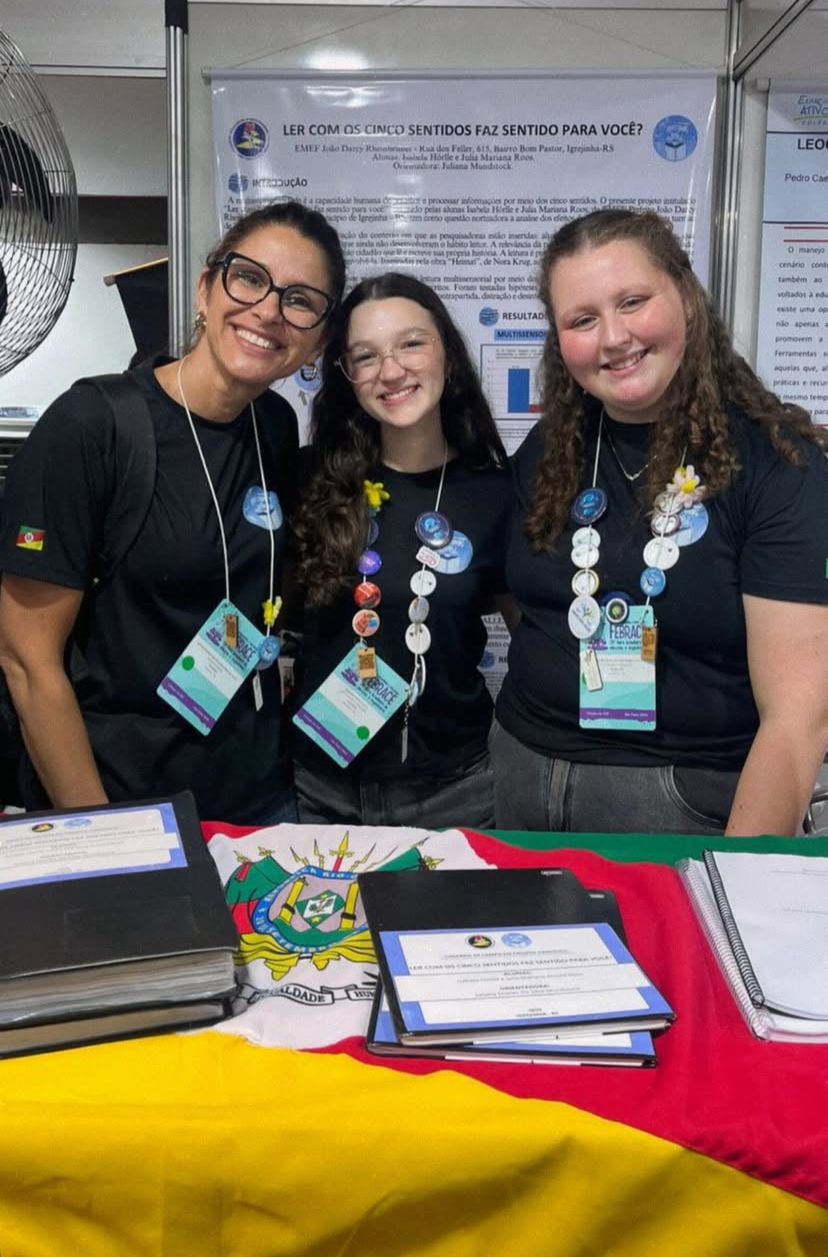 Duas alunas de Igrejinha estão participando da FEBRACE, maior mostra de iniciação científica e tecnológica pré-universitária do país, realizada na USP, em São Paulo. Isabela Hörlle e Julia Mariana Arnold Roos apresentam o projeto “Ler com os cinco sentidos faz sentido para você?”, com orientação da professora Juliana Soares da Silva Mundstock. O estudo investiga como a leitura multissensorial — envolvendo os cinco sentidos — pode melhorar a compreensão de textos. Aplicada com alunos do sétimo ano, a pesquisa mostrou que estímulos sensoriais aumentam o envolvimento, a compreensão e a retenção das informações. A FEBRACE segue até sexta-feira, dia 20 de março.