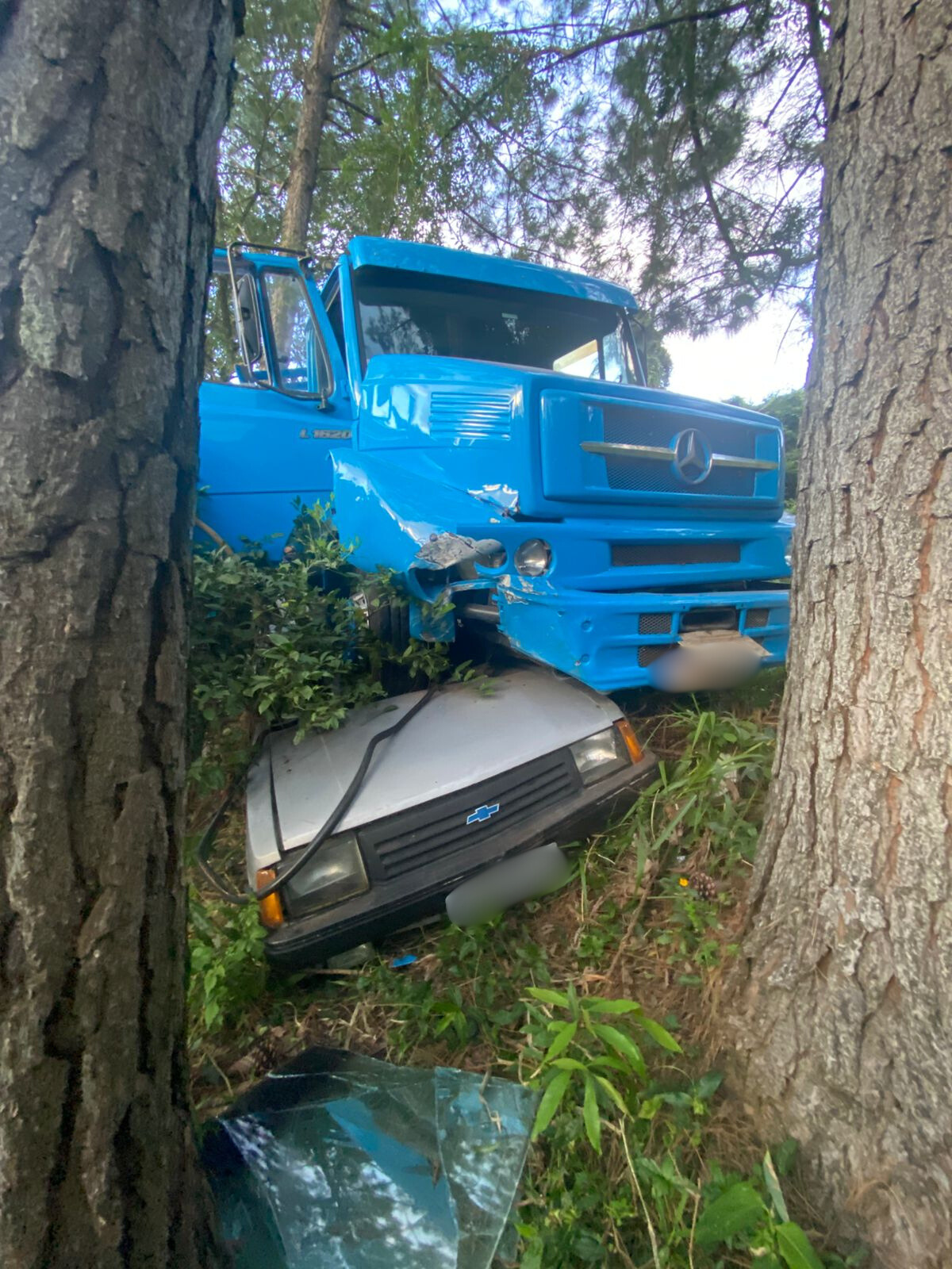 Um caminhão saiu da pista no quilômetro 17 da ERS-115, em Três Coroas, na tarde de ontem, e atingiu um carro que estava estacionado às margens da rodovia. De acordo com informações do Corpo de Bombeiros Voluntários de Três Coroas, não houve feridos no acidente, apenas danos materiais. O caminhão ficou acavalado sobre o automóvel, o que chamou a atenção de quem passava pelo local. As causas do acidente não foram informadas.