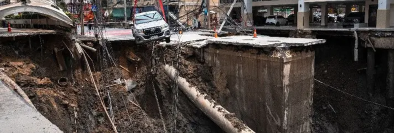 Uma cratera enorme de 50 metros de profundidade se abriu nesta quarta-feira em uma avenida movimentada no centro de Bangkok, capital da Tailândia. Segundo autoridades tailandesas, a cratera tem 50 metros de profundidade e cerca de 900 metros quadrados, e se abriu por conta de obras do metrô na região. Equipes de emergência foram acionadas para o local e contiveram o avanço do buraco. A cratera se abriu em frente ao Hospital Vajira, no centro da cidade, e interrompeu serviços públicos e o tráfego no local. O hospital anunciou a suspensão do atendimento de novos pacientes por conta do incidente.